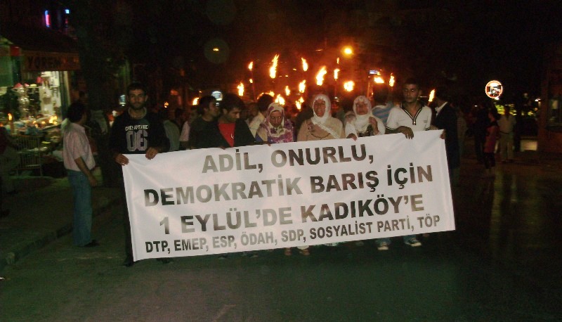 “Adil, Onurlu, Demokratik Barış için 1 Eylül’de Kadıköy’e” pankartı ile Cemevi’ne doğru yapılan yürüyüşte meşaleler yakıldı. Cemevi önündeki basın açıklamasında, Kürt sorununun çözümünün dünya barışına katkı yapacağı belirtildi. Türkiye devletinin anti-demokratik ve baskıcı uygulamaları eleştirilerek, “kendi halklarına barış ve özgürlüğü sağlayamayan bir zihniyetin Filistin ve Lübnan’da ya da dünyanın başka bir yerinde barışı sağlaması ne kadar samimidir” denildi.